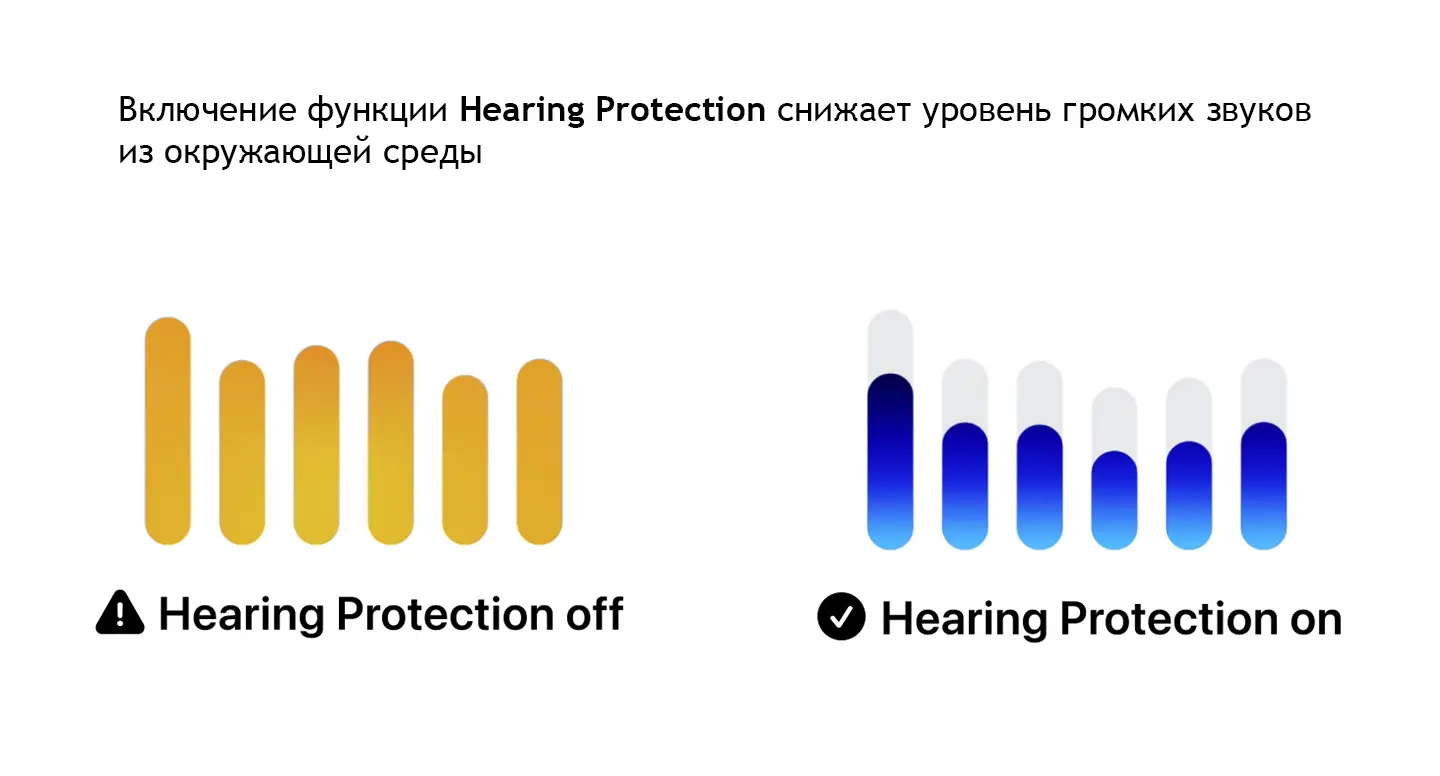 Для пользователей с лёгкой и умеренной потерей слуха доступна улучшенная функция Hearing Aid. Она усиливает речь и делает окружающий мир яснее — в офисе, на прогулке или в кафе.