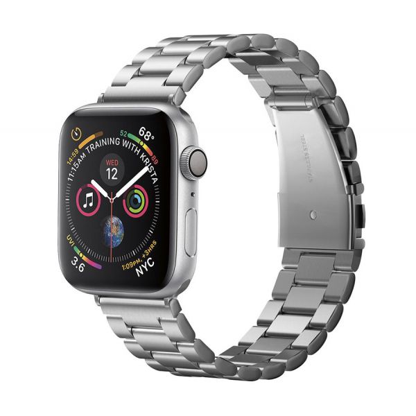 - Ремешок Spigen Modern Fit для Apple Watch 44 мм, стальной, серебристый.