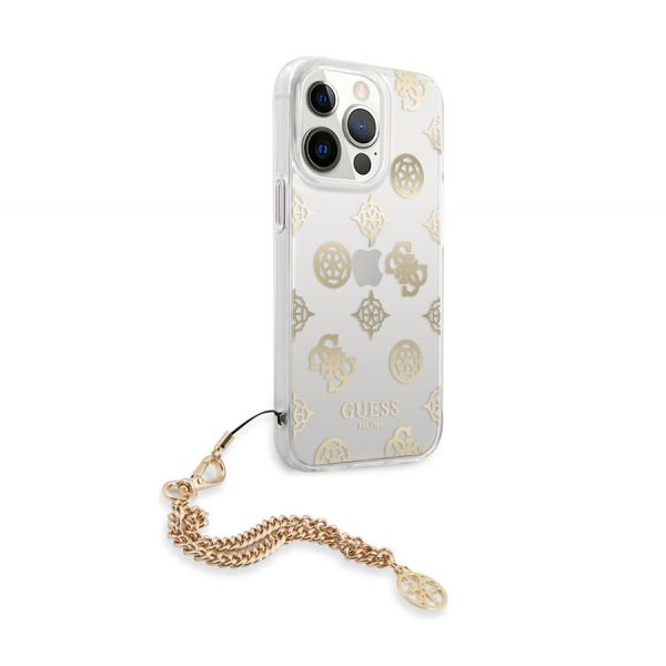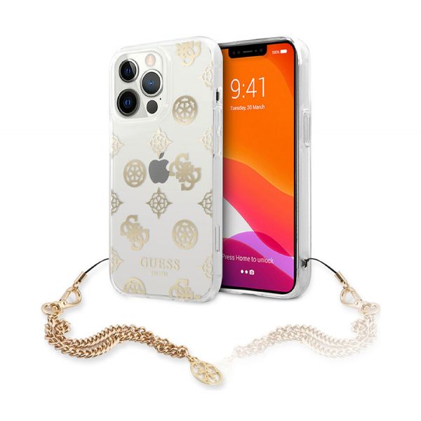 - Чехол-накладка Guess Peony Hard для iPhone 13 Pro Max, полиуретан / поликарбонат, золотой / прозрачный.