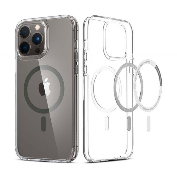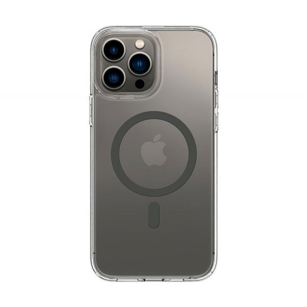 - Чехол-накладка Spigen Ultra Hybrid MagSafe для iPhone 13 Pro Max, полиуретан / поликарбонат, прозрачный / серый.