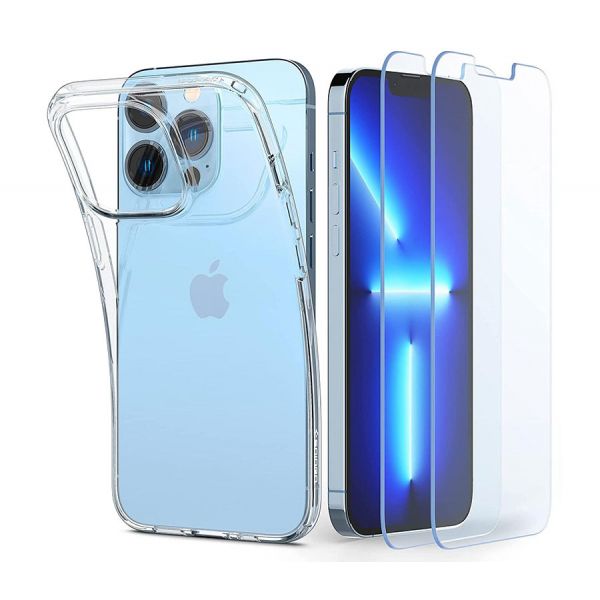 - Чехол-накладка Spigen Crystal Pack с защитным стеклом для iPhone 13 Pro, полиуретан прозрачный.