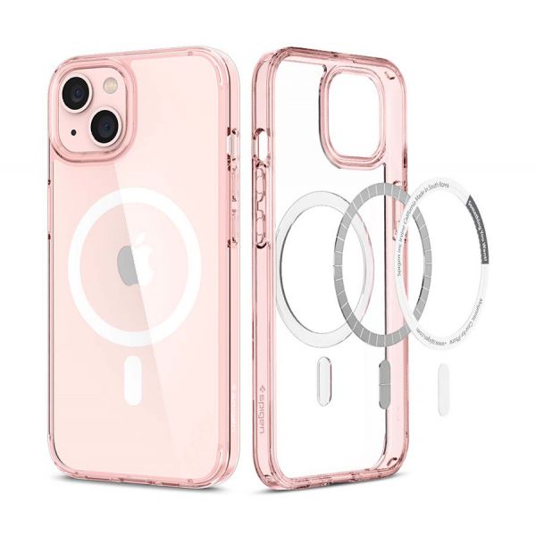 - Чехол-накладка Spigen Ultra Hybrid MagSafe для iPhone 13, полиуретан / поликарбонат, прозрачный / розовый.