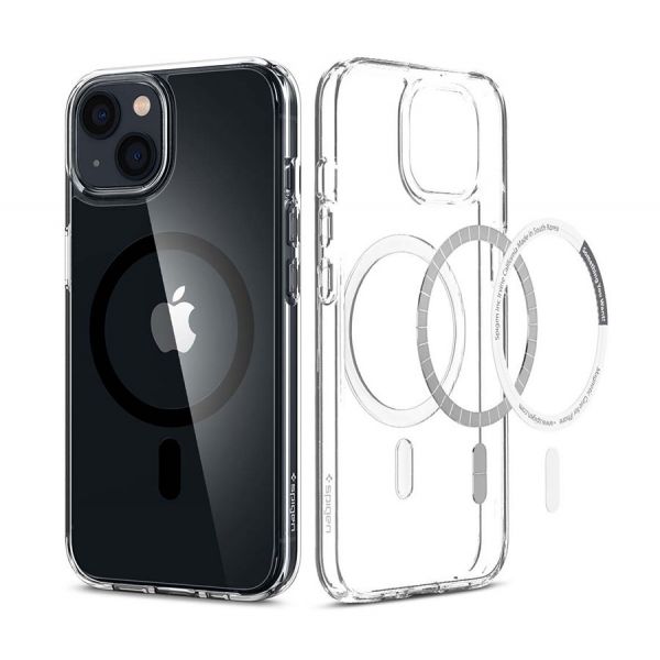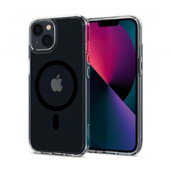 - Чехол-накладка Spigen Ultra Hybrid MagSafe для iPhone 13, полиуретан / поликарбонат, прозрачный / чёрный.