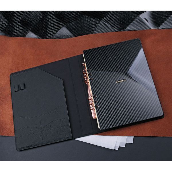 Блокнот Carbon Note Pad везде удобно взять с собой. Он не мнется за счет максимально жесткой карбоновой обложки, имеет формат А5, который с легкостью поместится даже в небольшую сумку. Кольцевой механизм в любой момент позволяет увеличить количество страниц или вернуть обратно необходимые записи.