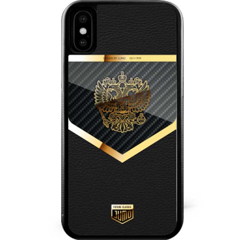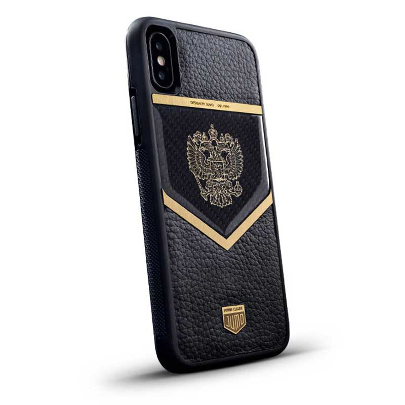 Эксклюзивный чехол Jumo Case для iPhone X/Xs, карбон, рамка из латуни, кожа Dakota, никель с позолотой 24К, «Герб РФ»