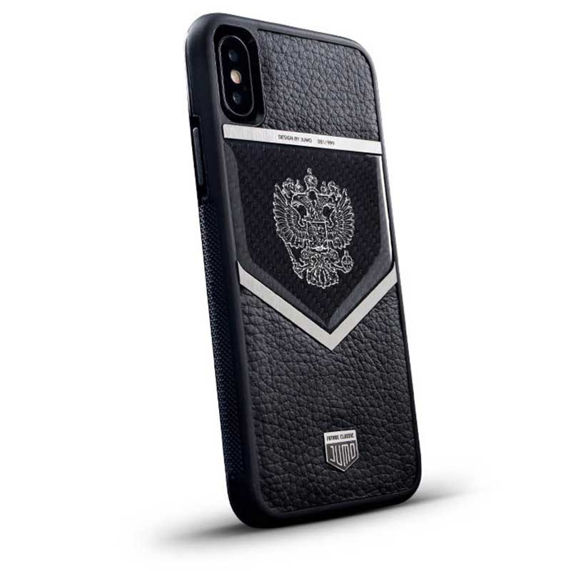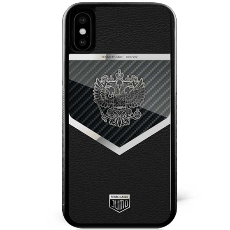 Эксклюзивный чехол Jumo Case для iPhone X/Xs, карбон, стальная рамка, кожа Dakota, никель с серебрением, «Герб РФ»