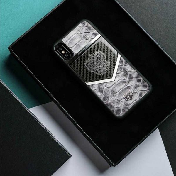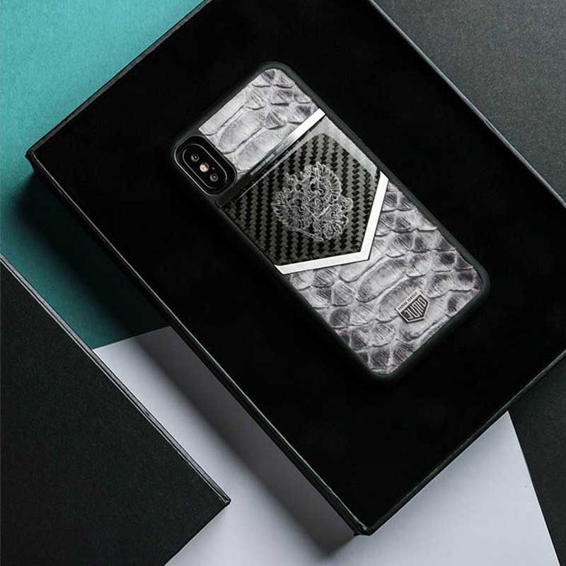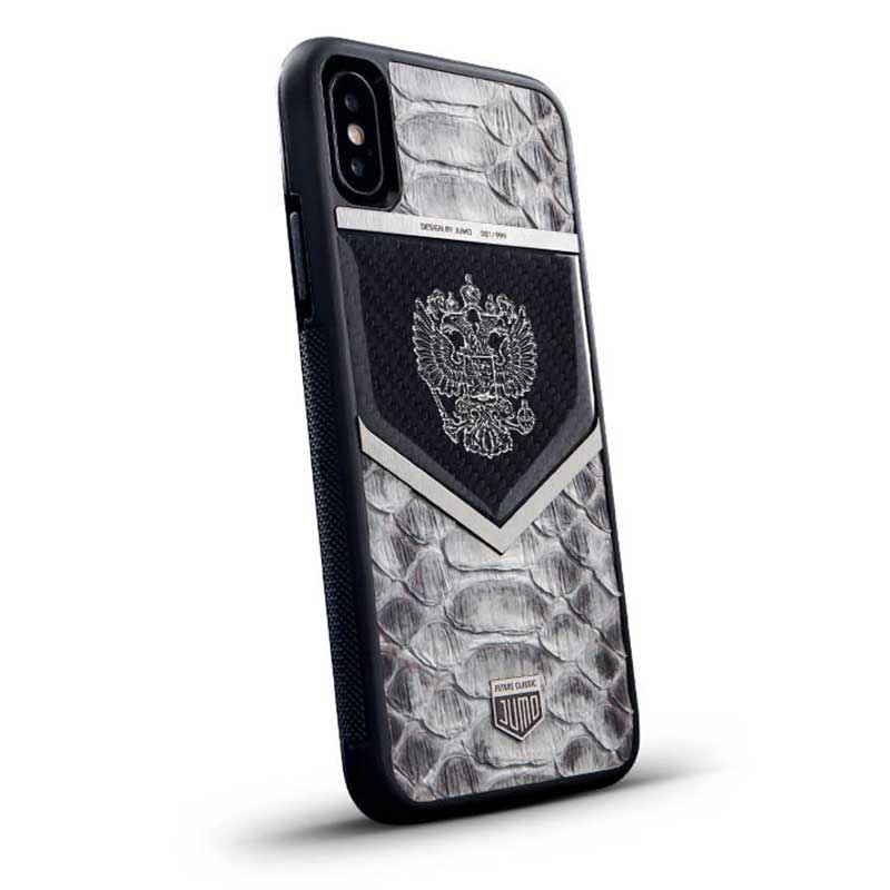 - Чехол Jumo Case для iPhone X карбон, стальная рамка, натуральная кожа питона, никель с посеребрением, белый "Герб РФ";