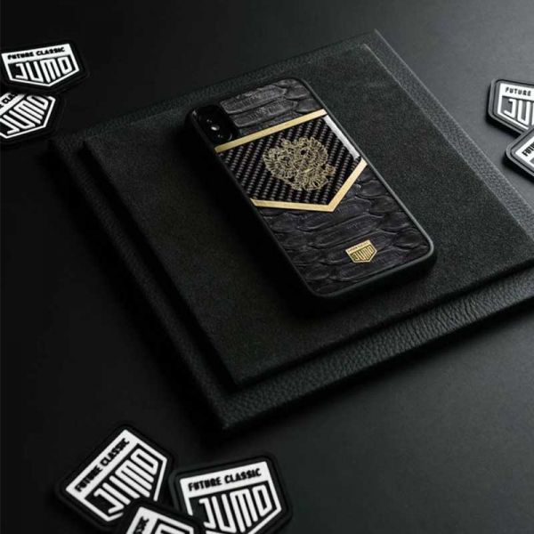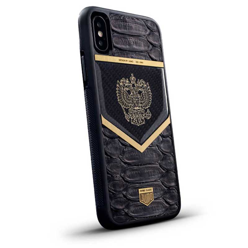 - Чехол Jumo Case для iPhone X карбон, рамка из латуни, натуральная кожа питона, никель с позолотой 24К, "Герб РФ";