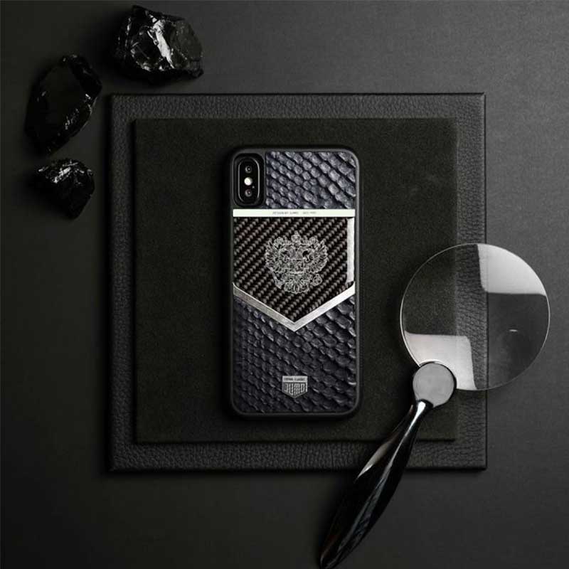Кейс выполнен из силиконовой основы и карбоновой вставки, покрытой слоем ювелирной смолы. Данная конструкция обеспечивает надежную защиту смартфона от повреждений и деформации по всему периметру. Оригинальным декоративным элементом является стальная рамка, которая придает дополнительную прочность и износостойкость. В центральной части кейса расположен герб Российской Федерации, выполненный из никеля c посеребрением. Чехол дополнен натуральной кожей питона, которая добавляет аксессуару статус премиум.