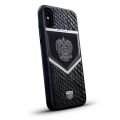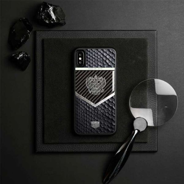 - Чехол Jumo Case для iPhone X карбон, стальная рамка, натуральная кожа питона, никель с посеребрением, "Герб РФ";