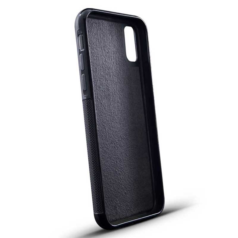 Кейс выполнен из силиконовой основы и карбоновой вставки, покрытой слоем ювелирной смолы. Данная конструкция обеспечивает надежную защиту смартфона от повреждений и деформации по всему периметру. С лицевой стороны расположен эластичный кант шириной 0,7 мм, препятствующий соприкосновению экрана с плоскими поверхностями.