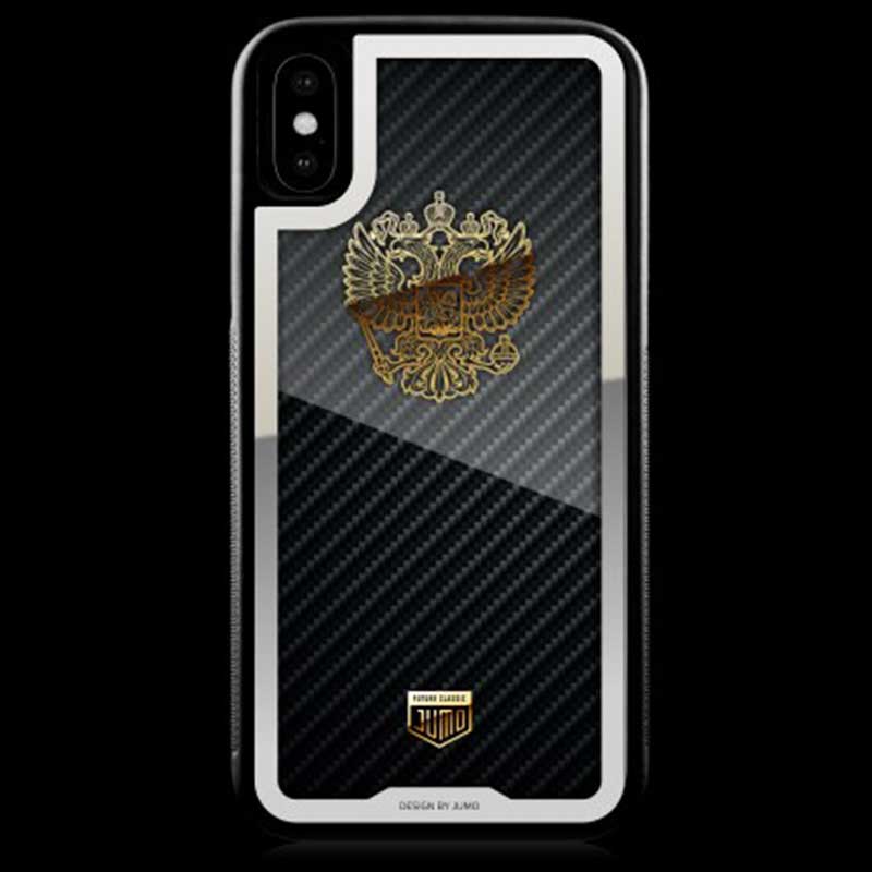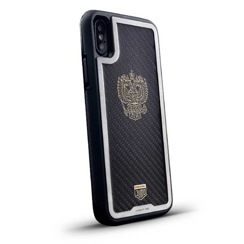 Эксклюзивный чехол Jumo Case для iPhone X/Xs, карбон, стальная рамка, никель с позолотой 24К, «Герб РФ»