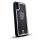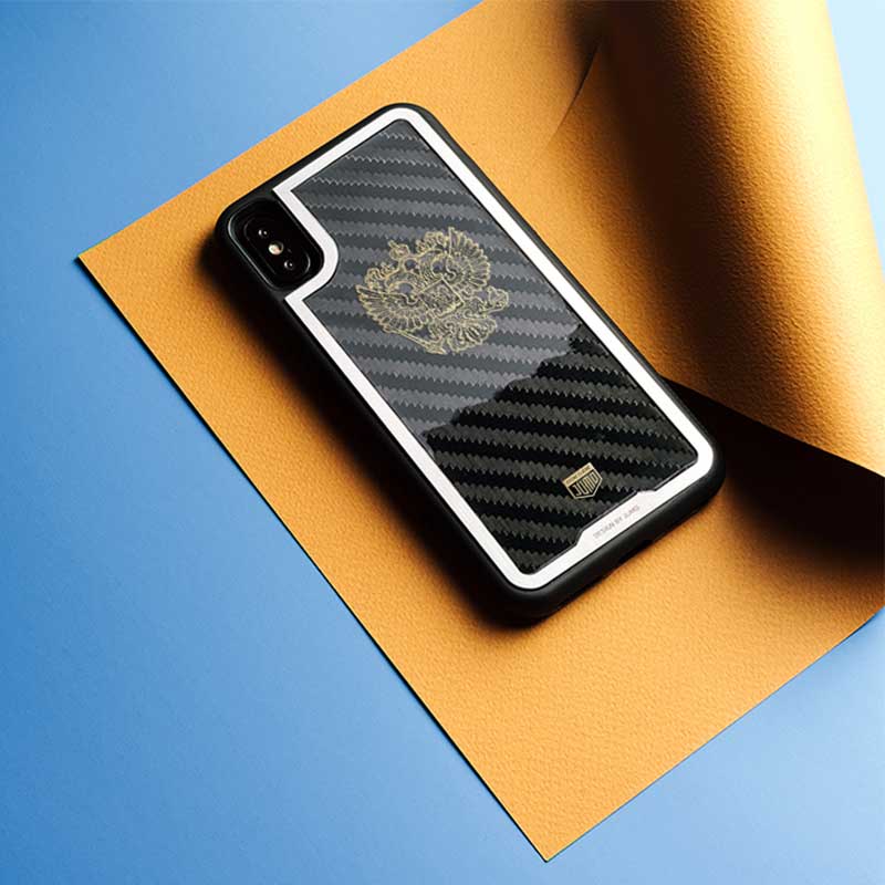 Кейс выполнен из силиконовой основы и карбоновой вставки, покрытой слоем ювелирной смолы. Данная конструкция обеспечивает надежную защиту смартфона от повреждений и деформации по всему периметру. С лицевой стороны расположен эластичный кант шириной 0,7 мм, препятствующий соприкосновению экрана с плоскими поверхностями. Кроме того, дополнительную прочность карбону придает стальная рамка, которая также является оригинальным декоративным элементом и защищает слой смолы. В центральной части кейса расположен герб Российской Федерации, выполненный из никеля c позолотой 24К.