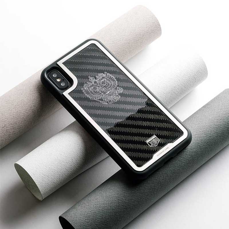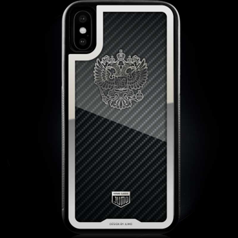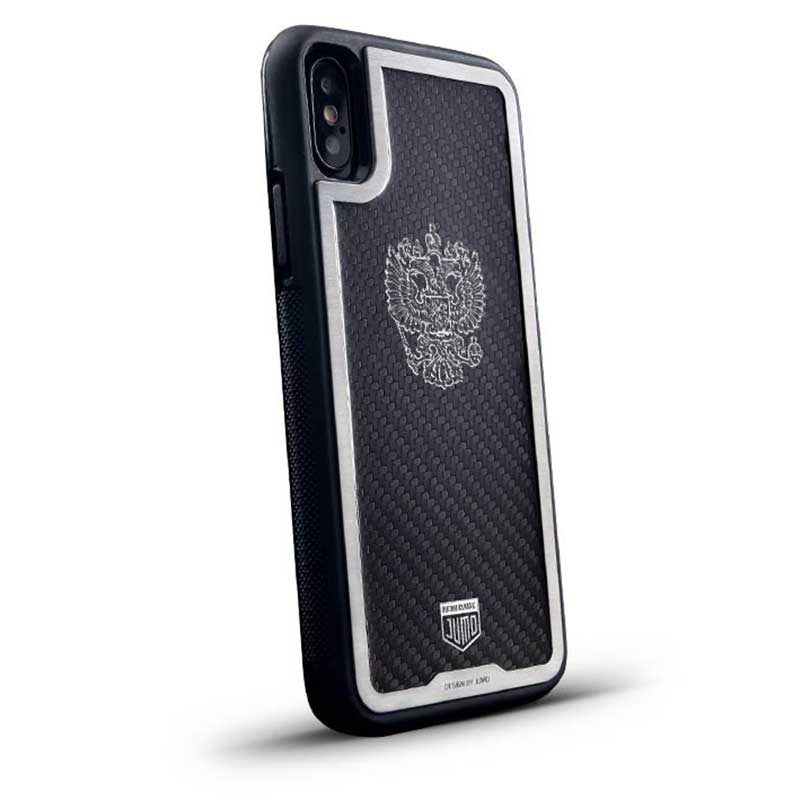 Эксклюзивный чехол Jumo Case для iPhone X/Xs, карбон, стальная рамка, никель с серебрением, «Герб РФ»