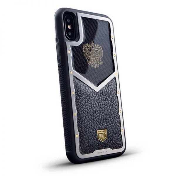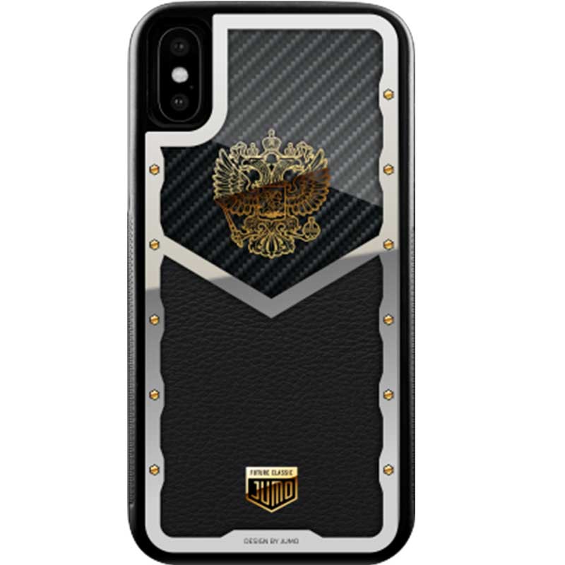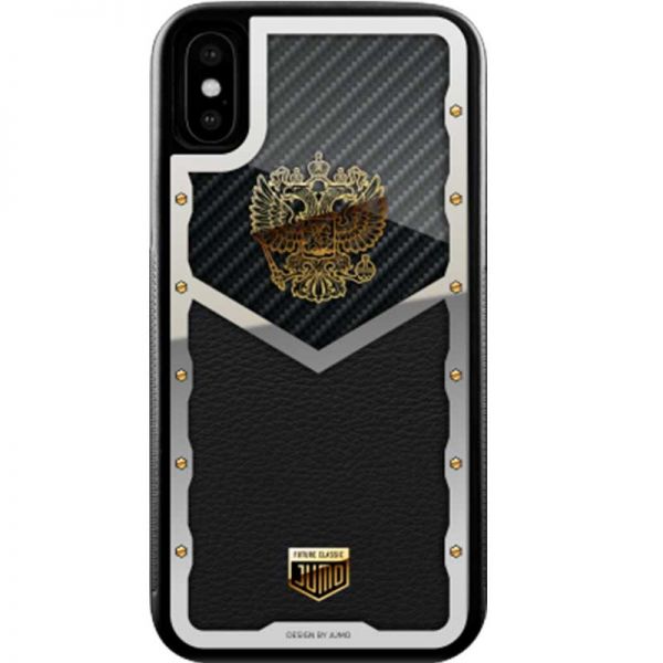 Эксклюзивный чехол Jumo Case для iPhone X/Xs, карбон, стальная рамка, кожа Dakota, никель с позолотой 24К, «Герб РФ»