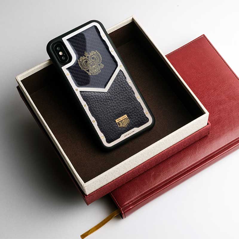 Кейс выполнен из силиконовой основы и карбоновой вставки, покрытой слоем ювелирной смолы. Данная конструкция обеспечивает надежную защиту смартфона от повреждений и деформации по всему периметру. Кроме того, дополнительную прочность и износостойкость карбону придает специальная рамка из сплава титана и стали, которая декорирована болтами из латуни. В центральной части кейса расположен герб Российской Федерации, выполненный из никеля c позолотой 24. Чехол дополнен натуральной кожей Dakota, которая добавляет аксессуару статус премиум.