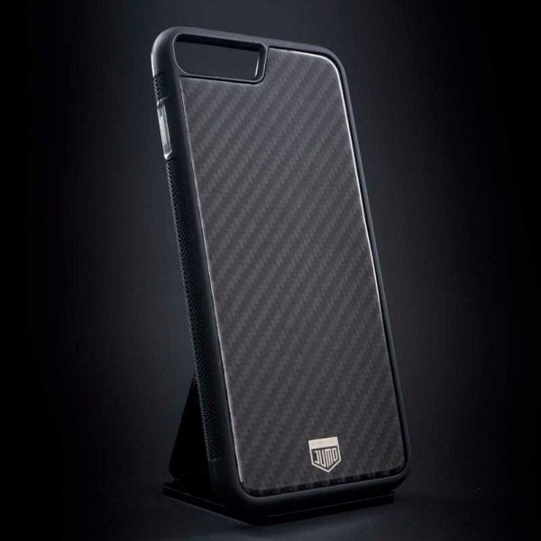 - Чехол Jumo Case для iPhone 7 и 8, выполненный из черного карбона с логотипом Jumo из никеля с серебрением и позолотой,