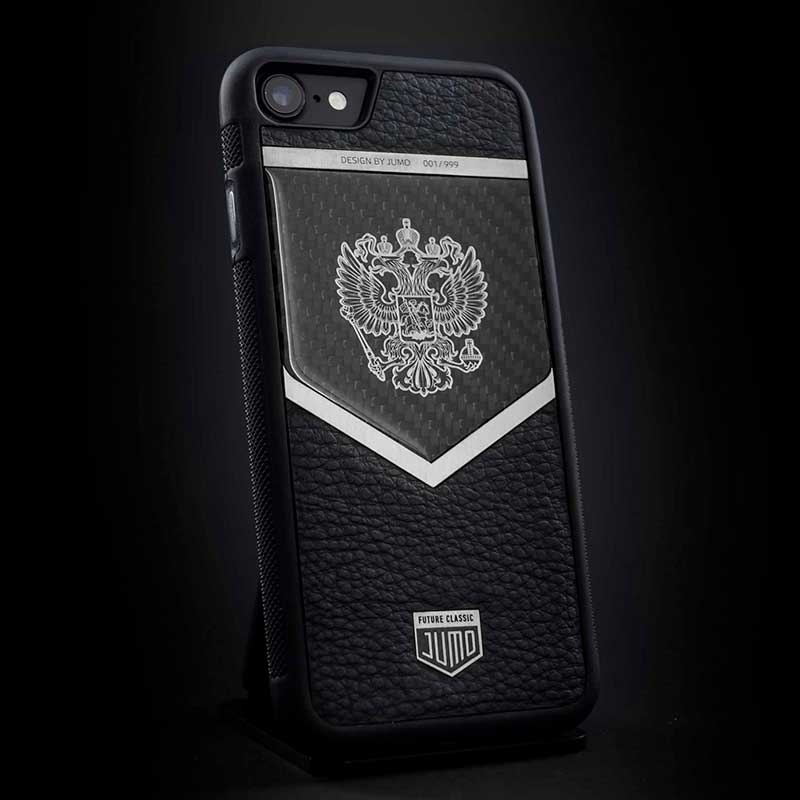 - Чехол Jumo Case для iPhone 7 и 8, выполненный из натуральной кожи Dakota, карбона, с герфом РФ из никеля с посеребрением;