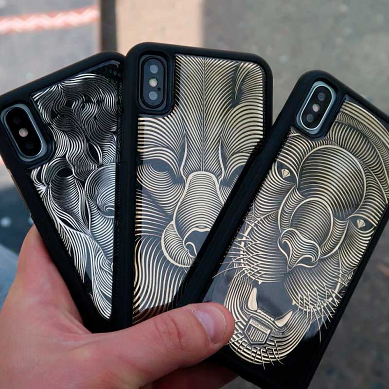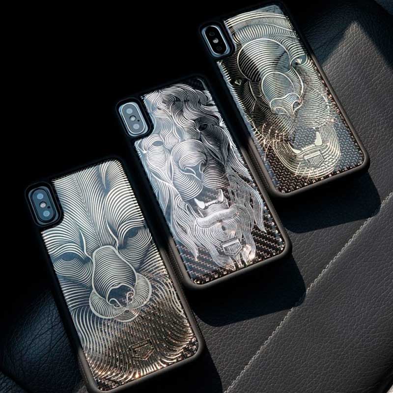 - Чехол Jumo Case для iPhone X (10), выполненный из натурального карбона, с принтом "Звери" из никеля с позолотой или серебрением;