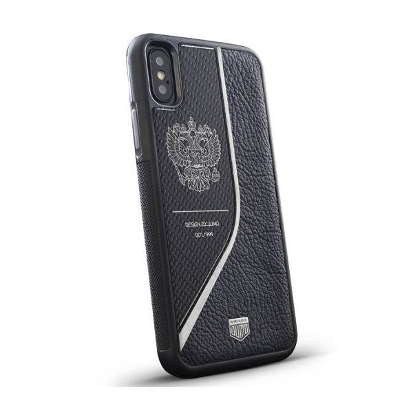 Представляем вам кейс из роскошной коллекции бренда Jumo для iPhone Xs Max - уникальное сочетание функциональности и практичности с ярким дизайном и качественными материалами. Аксессуар несомненно подчеркнет безупречный стиль и статус своего владельца. Лицевая сторона аксессуара порадует вас идеальным сочетанием материалов, основной акцент среди которых имеет натуральная итальянская кожа. Выполнена она из качественной телячьей кожи - невероятно мягкого и приятного на ощупь материала. По центру чехла располагается вставка из натурального карбона, на которой находится герб РФ, выполненный из никеля с посеребрением. По периметру карбоновой вставки проходит защитная рамка из сплава медицинской стали и титана, и завершает образ логотип компании-производителя Jumo.