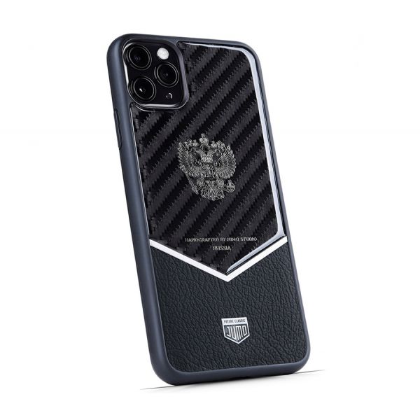 Представляем вам кейс из роскошной коллекции бренда Jumo для iPhone 11 Pro - уникальное сочетание функциональности и практичности с ярким дизайном и качественными материалами. Аксессуар несомненно подчеркнет безупречный стиль и статус своего владельца. Лицевая сторона аксессуара порадует вас идеальным сочетанием материалов, основной акцент среди которых имеет натуральная итальянская кожа. Выполнена она из качественной телячьей кожи - невероятно мягкого и приятного на ощупь материала. По центру чехла располагается вставка из натурального карбона, на которой находится герб РФ, выполненный из никеля с посеребрением. По периметру карбоновой вставки проходит защитная рамка из сплава медицинской стали и титана, и завершает образ логотип компании-производителя Jumo.