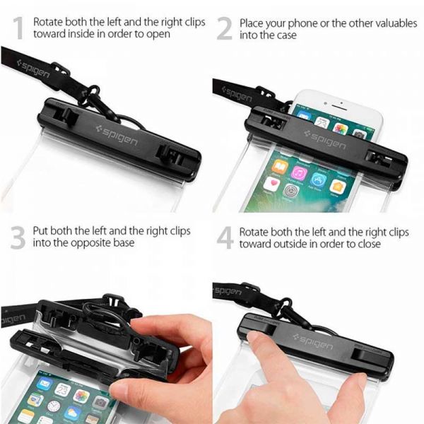 Spigen Velo - это чехол для вашего смартфона. Аксессуар способен вместить в себя не только смартфон, но и пластиковые карты. Таким образом, находясь на пляже, вы сможете все самое ценное носить с собой. На чехле предусмотрен небольшой ремешок, его следует надевать на шею. Возможность регулировки позволяет выбрать самую оптимальную длину. С помощью данного чехла можно делать крутые снимки под водой: стенки чехла тонкие и полностью прозрачные, не искажают цветопередачу и не препятствуют работе камеры.