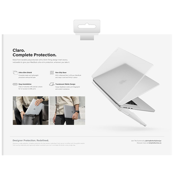 Полупрозрачный чехол-накладка Uniq HUSK Pro CLARO точно повторяет форму MacBook Air 15" и почти не заметен на устройстве. Матовая поверхность снижает блики и защищает от царапин, не скрывая фирменный дизайн. Надёжные клипсы фиксируют чехол, а резиновые ножки не дают скользить на поверхности.
