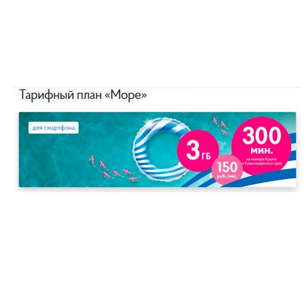Тарифный план "Море" от оператора мобильной связи Волна. Тариф работает на территории Республики Крым. Объем интернет-трафика, включённого в пакет услуг, предоставляемого на максимально возможной скорости: в сети 4G (LTE) до 75 Мбит/сек., в сети 3G (UMTS) — до 21 Мбит/сек., в сети 2G (GPRS или EDGE) — до 240 Кбит/сек.