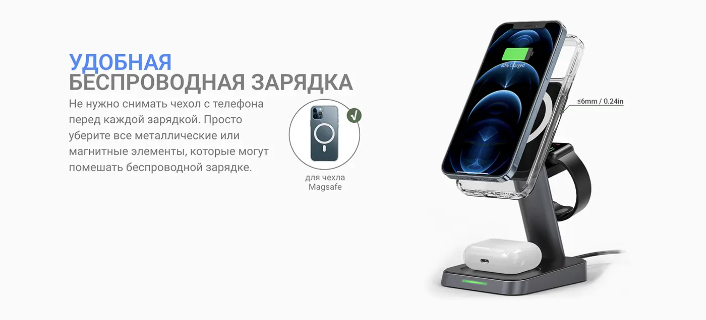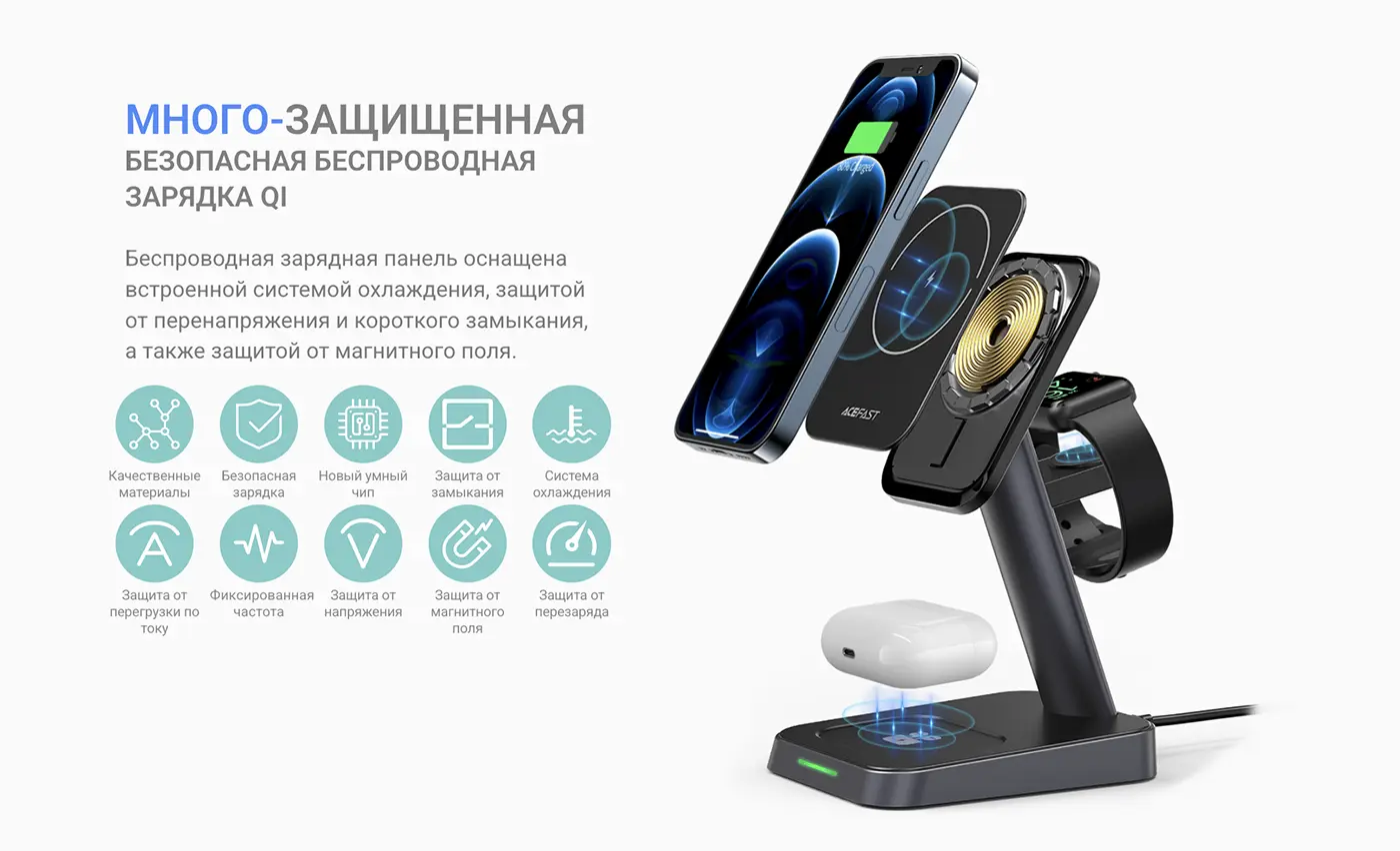 Быстрое и безопасное питание для AirPods/других TWS-наушников (5 Вт) и Apple Watch (2.5 Вт).