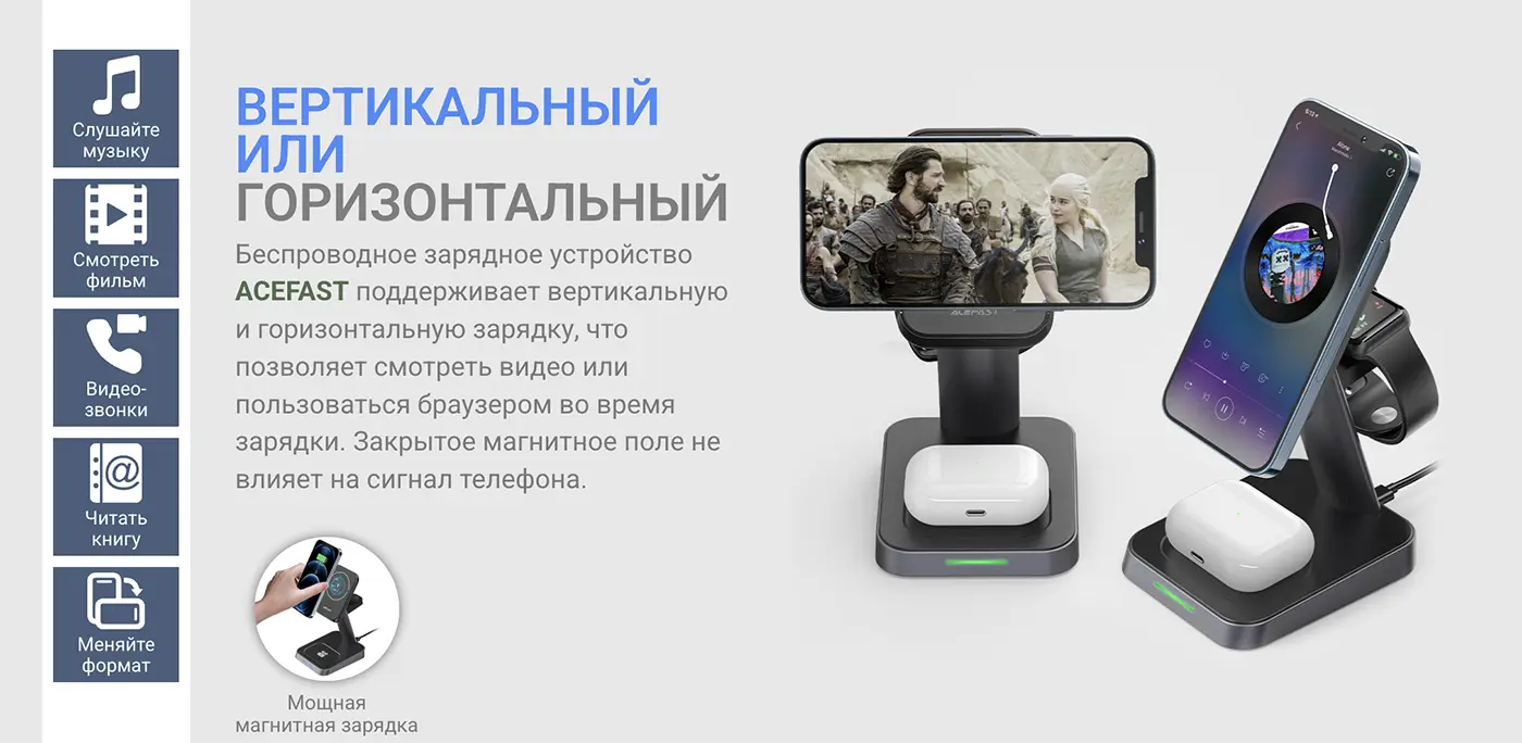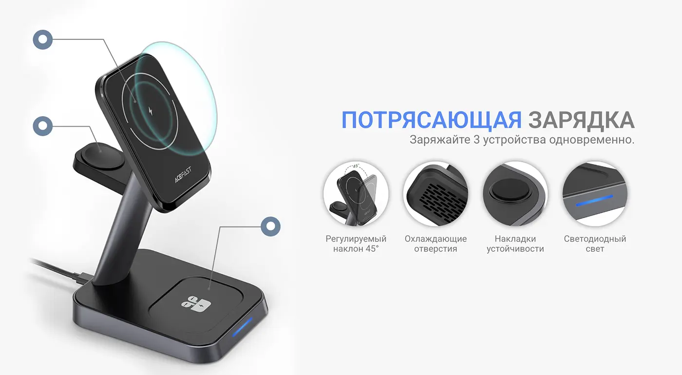 Беспроводное зарядное устройство Acefast E3 — это стильная и практичная станция, объединяющая сразу три зарядные зоны. Поддерживает мощную зарядку iPhone с MagSafe (до 15 Вт), беспроводную зарядку для наушников (5 Вт) и Apple Watch (2.5 Вт) — одновременно.