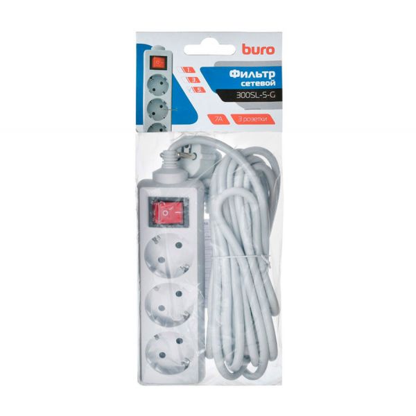 Сетевой фильтр Buro 300SL-5-G, 3 розетки, 5 метров, 7А, серый