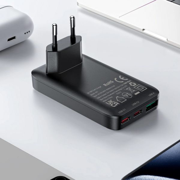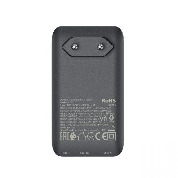 Сетевое зарядное устройство Acefast A100, 3 порта с 2 PD USB-C + 1 USB-A, PD 65 Вт GaN, чёрный
