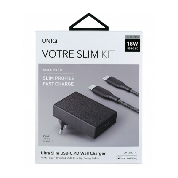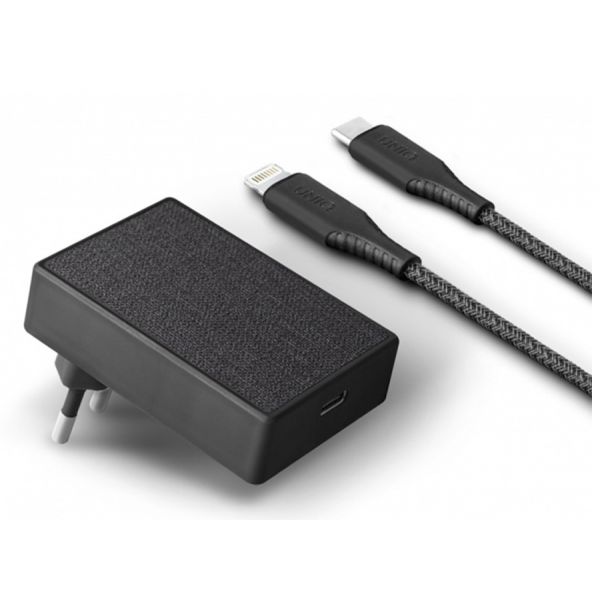 Сетевое зарядное устройство Uniq Votre, USB-C, 18 Вт, 3А, с кабелем на Lightning (MFi), чёрный