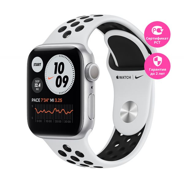 Apple Watch Series 6, 40 мм, серебристый корпус, спортивный ремешок Nike «чистая платина/чёрный»