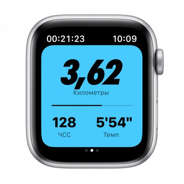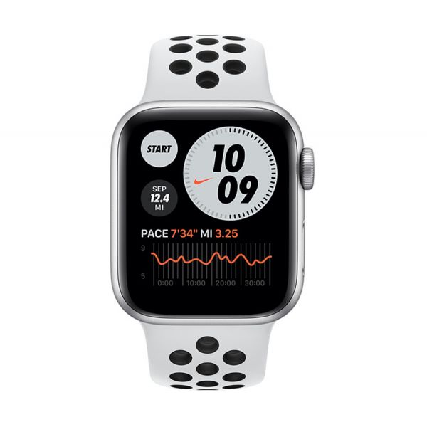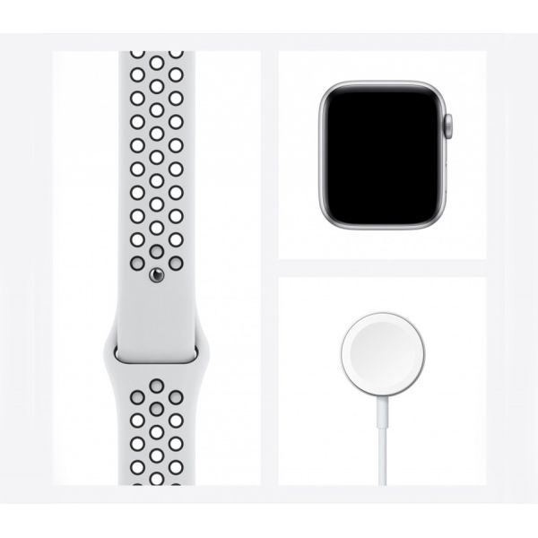 Apple Watch Series 6, 44 мм, серебристый корпус, спортивный ремешок Nike «чистая платина/чёрный»