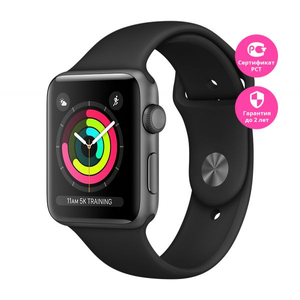 Apple Watch Series 3, 42 мм, корпус "серый космос", чёрный спортивный ремешок