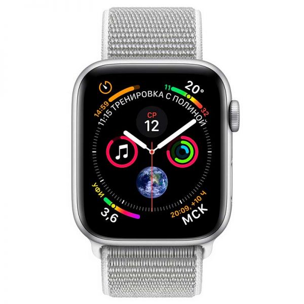 Apple Watch Series 4, 40 мм, серебристый корпус, спортивный браслет "белая ракушка"
